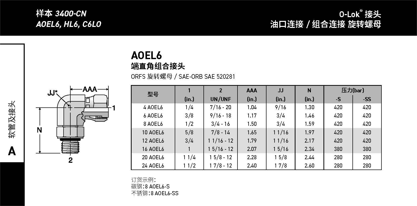 AOEL6 端直角組合接頭 ORFS 旋轉螺母 / SAE-ORB SAE 520281