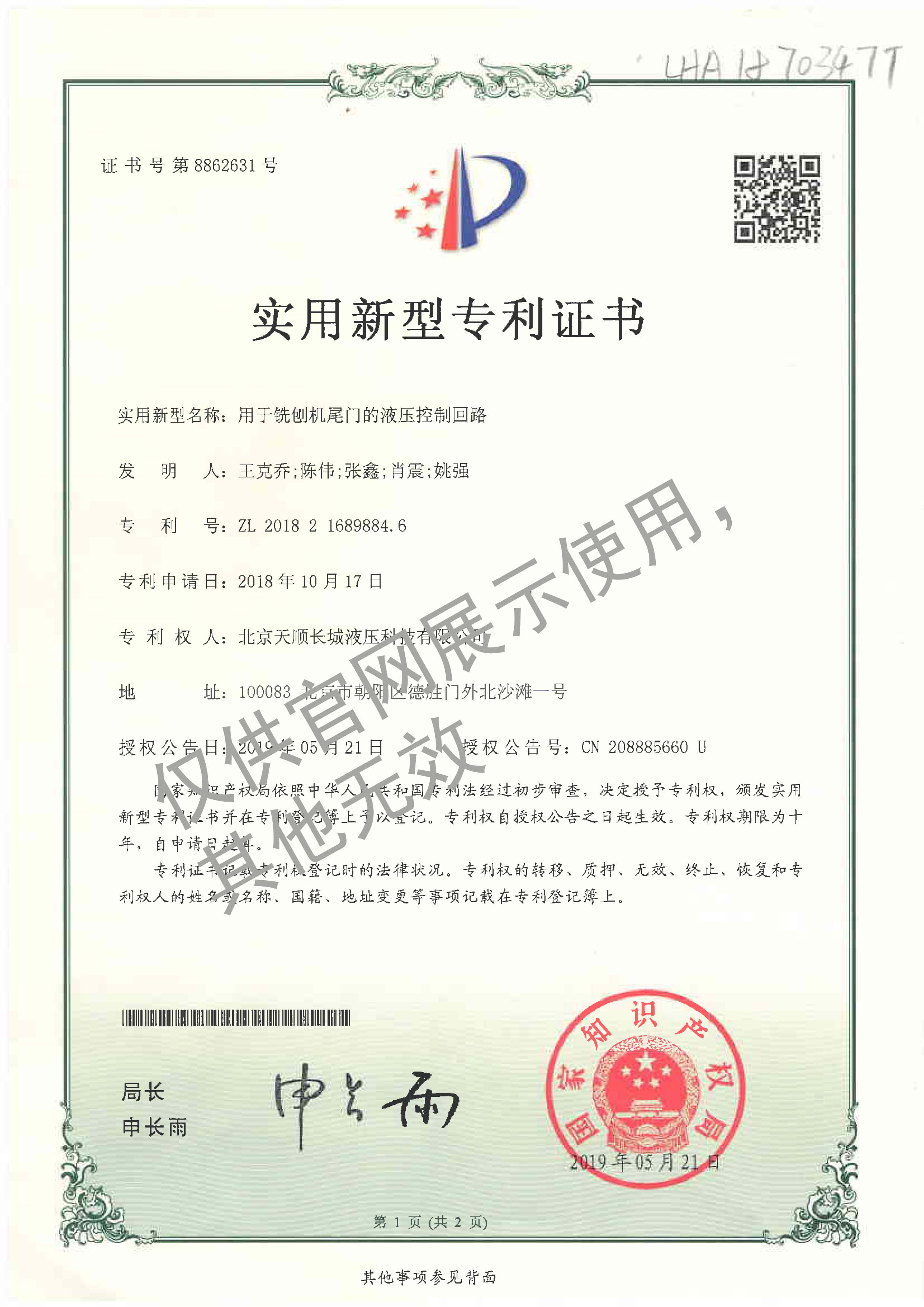 29-ZL201821689884.6實用新型專利-用于銑創(chuàng)機(jī)尾門的液壓控制回路20181017
