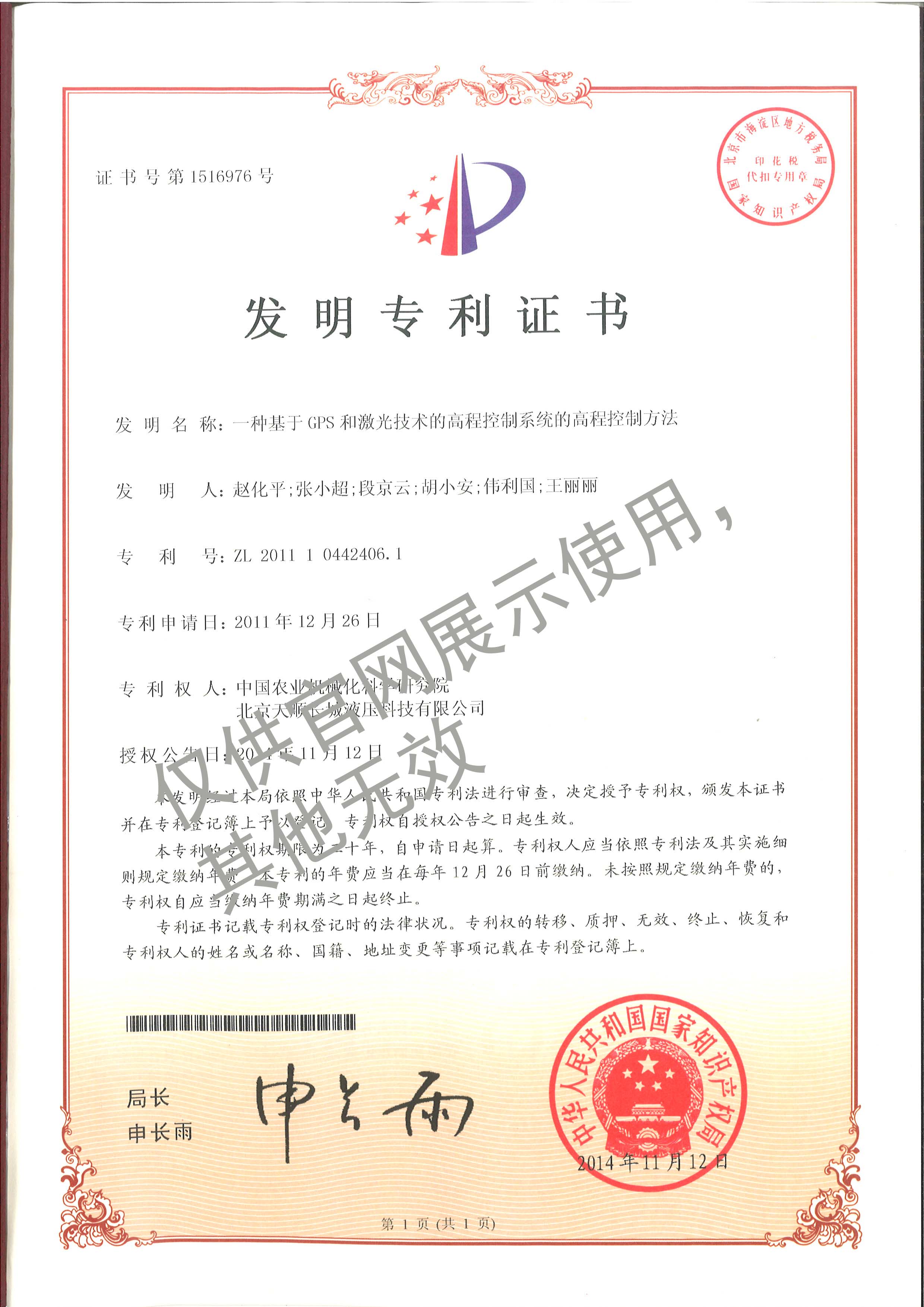 11-ZL201110442406.1發(fā)明專利-一種基于GPS和激光技術的高程控制系統(tǒng)的高程控制方法20111226