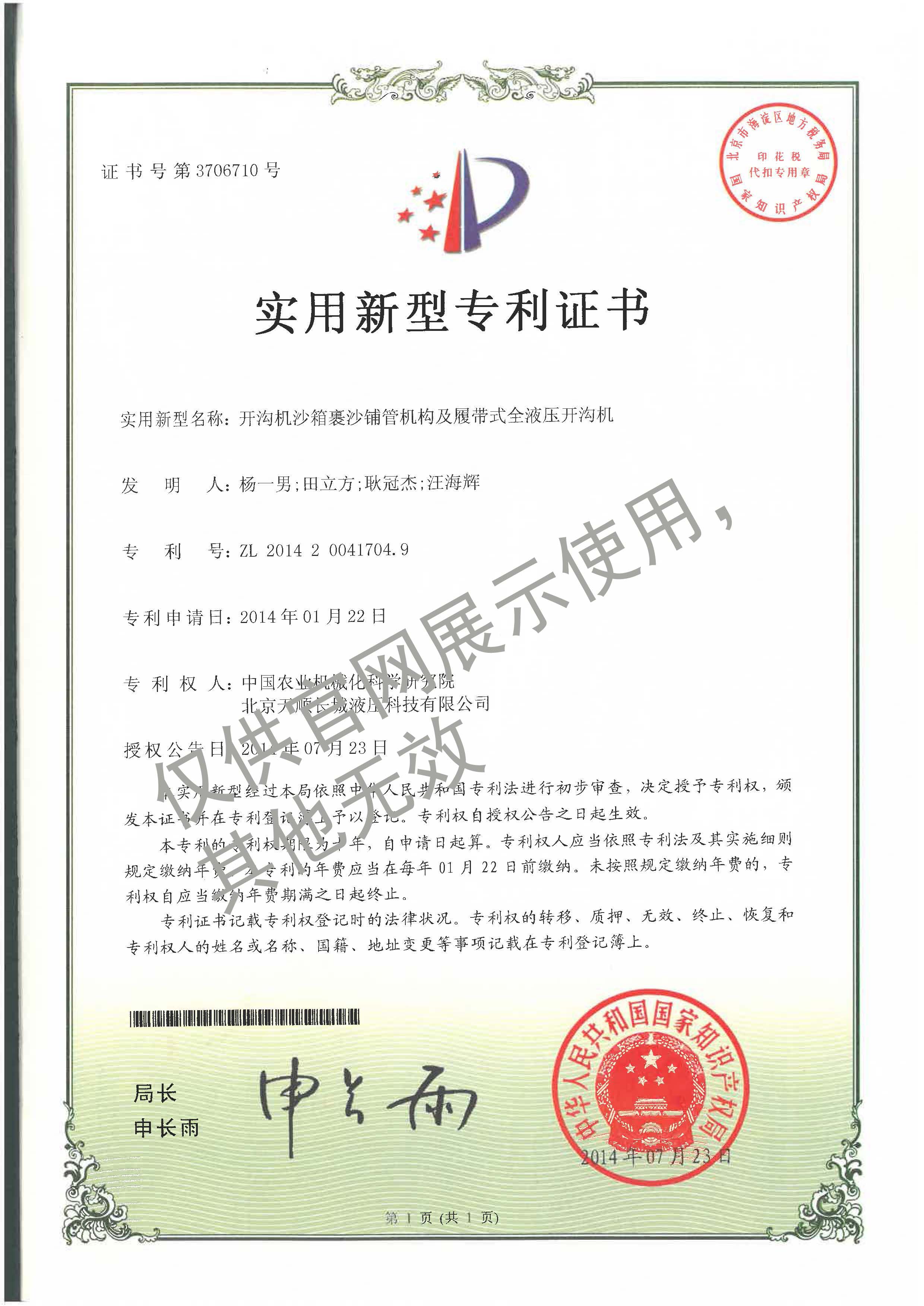 12-ZL201110442406.1實用新型專利 -開溝機沙箱裹沙鋪管機構及履帶式全液壓開溝機20140122