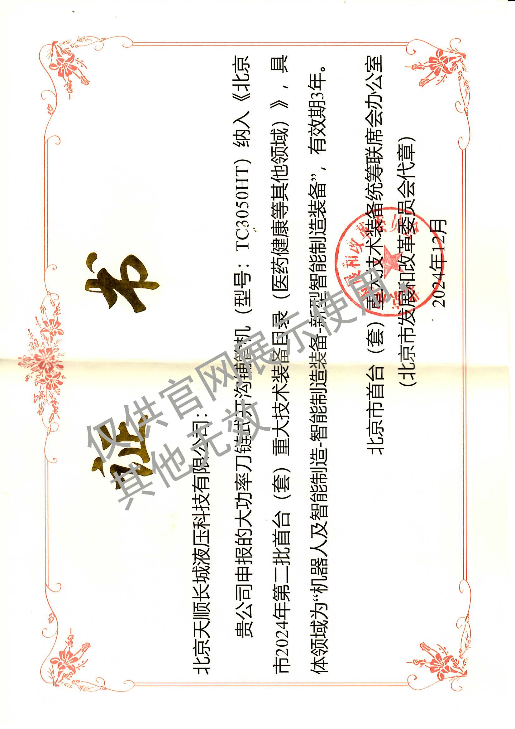 北京市首臺(tái)(套)重大技術(shù)裝備證書(shū)