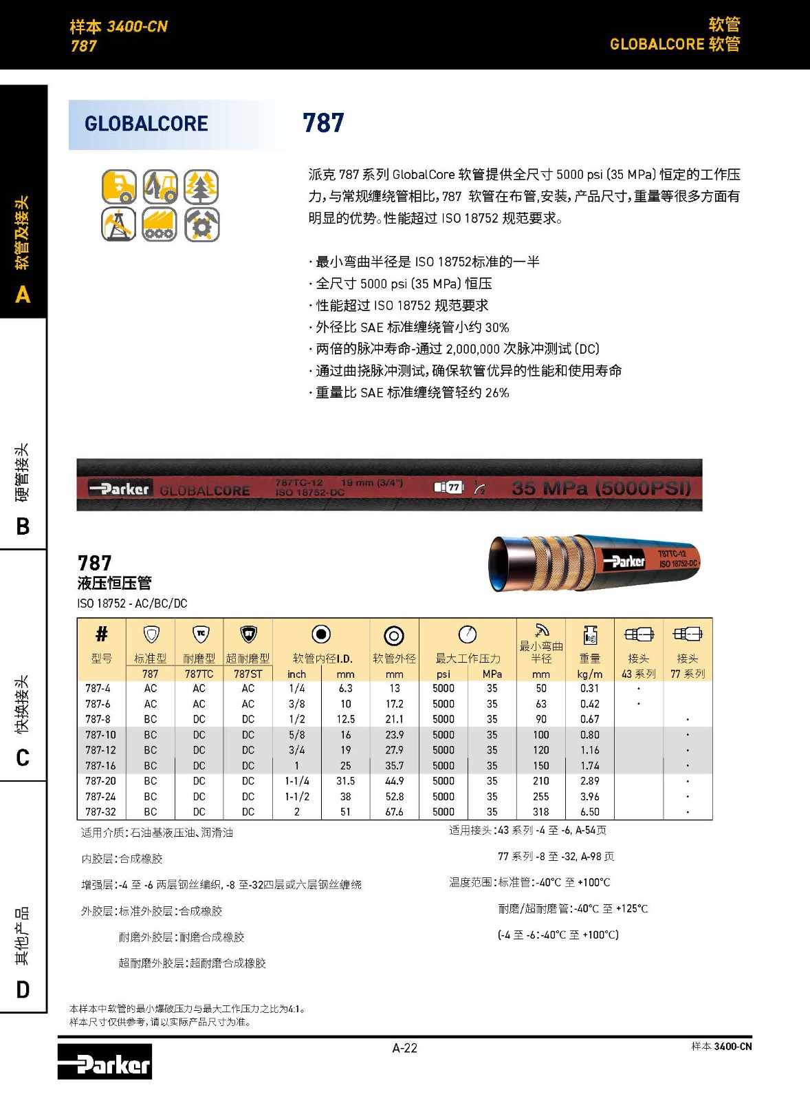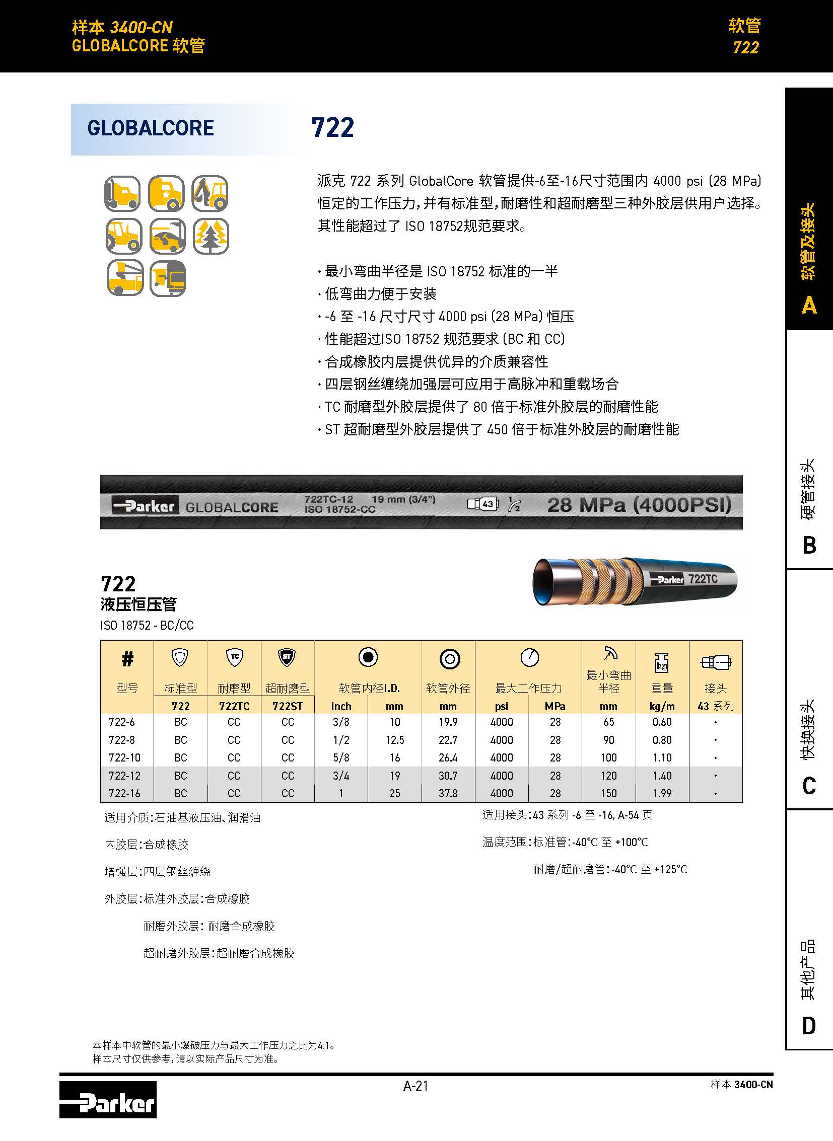 派克 722 系列 GlobalCore 軟管提供-6至-16尺寸范圍內(nèi) 4000 psi (28 MPa) 恒定的工作壓力,并有標(biāo)準(zhǔn)型,耐磨性和超耐磨型三種外膠層供用戶選擇。其性能超過了 ISO 18752規(guī)范要求。