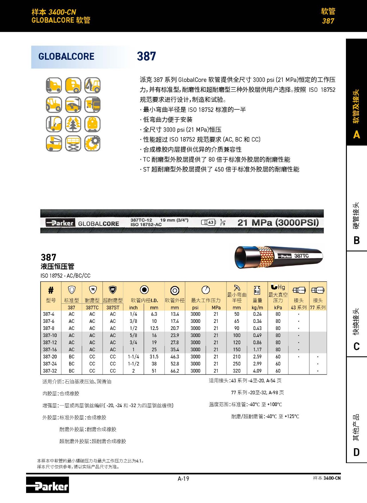 派克 387 系列GlobalCore 軟管提供全尺寸 3000 psi (21 MPa)恒定的工作壓力,并有標(biāo)準(zhǔn)型,耐磨性和超耐磨型三種外膠層供用戶選擇。按照 ISO 18752 規(guī)范要求進(jìn)行設(shè)計,制造和試驗。