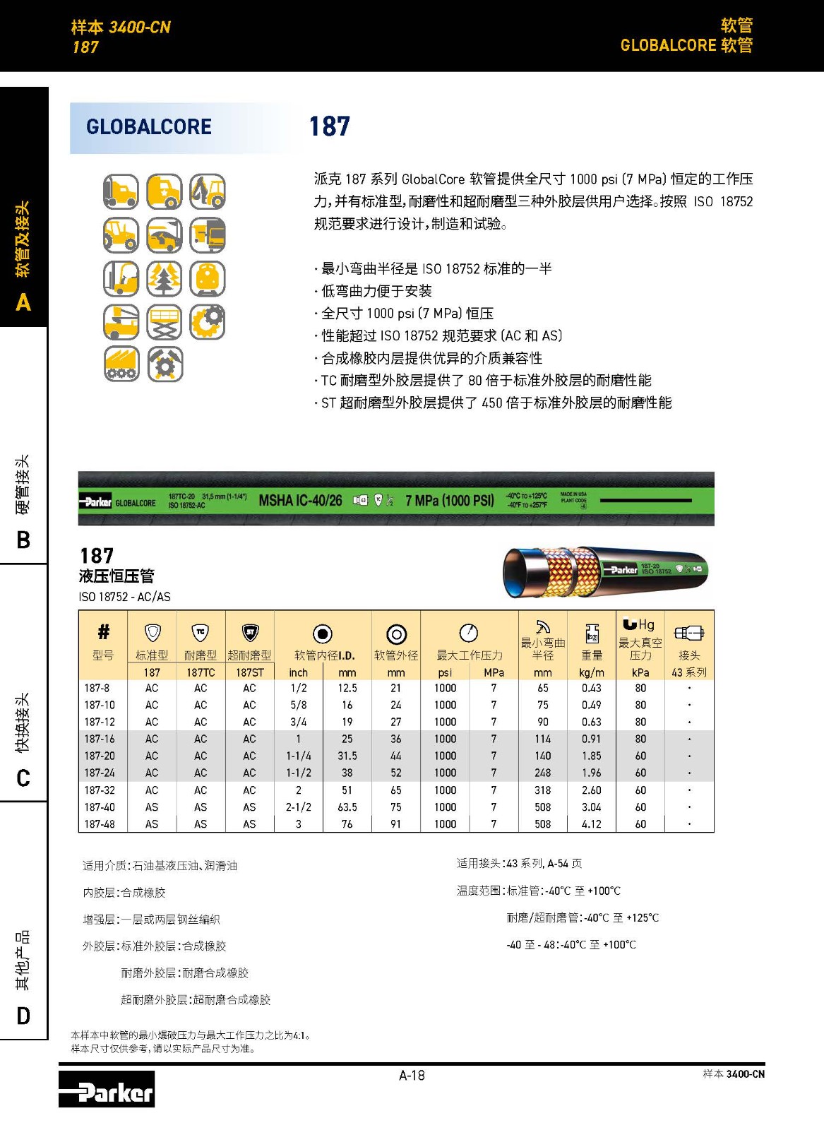 派克 187 系列GlobalCore 軟管提供全尺寸 1000 psi (7 MPa) 恒定的工作壓力,并有標(biāo)準(zhǔn)型,耐磨性和超耐磨型三種外膠層供用戶選擇。按照 ISO 18752 規(guī)范要求進(jìn)行設(shè)計,制造和試驗。