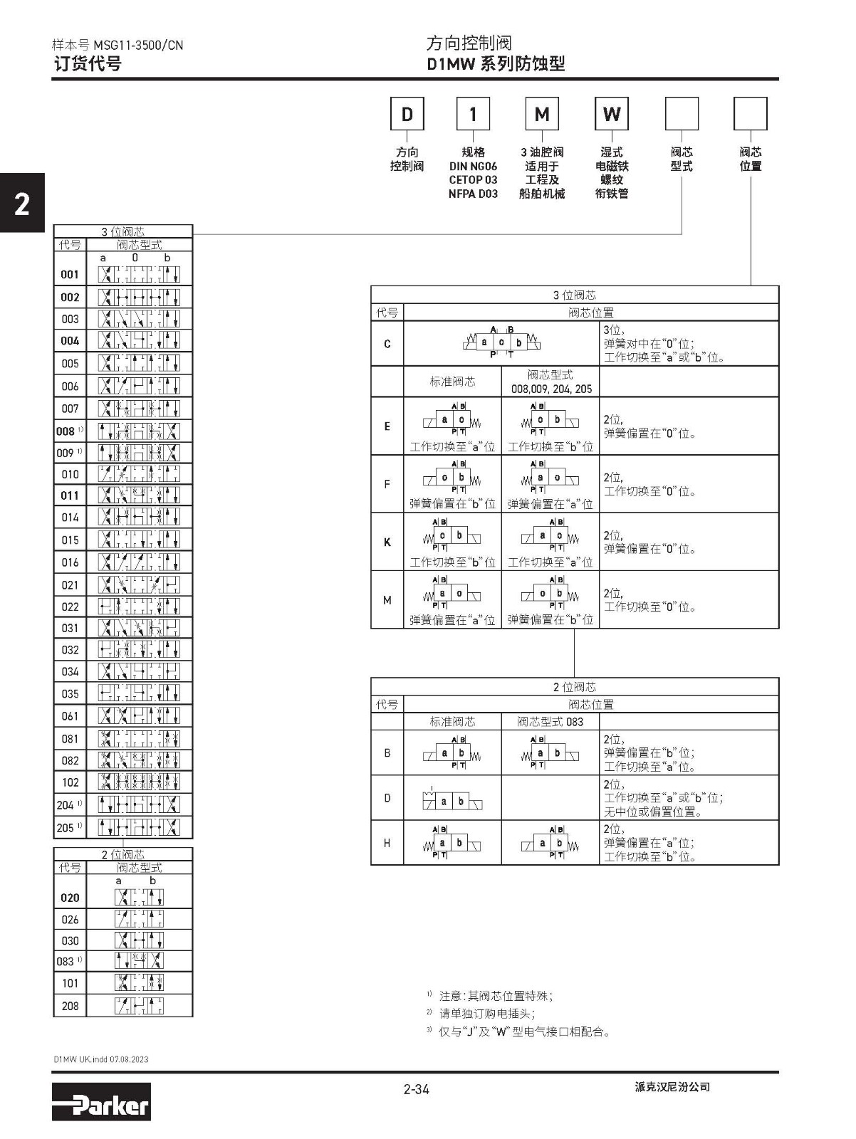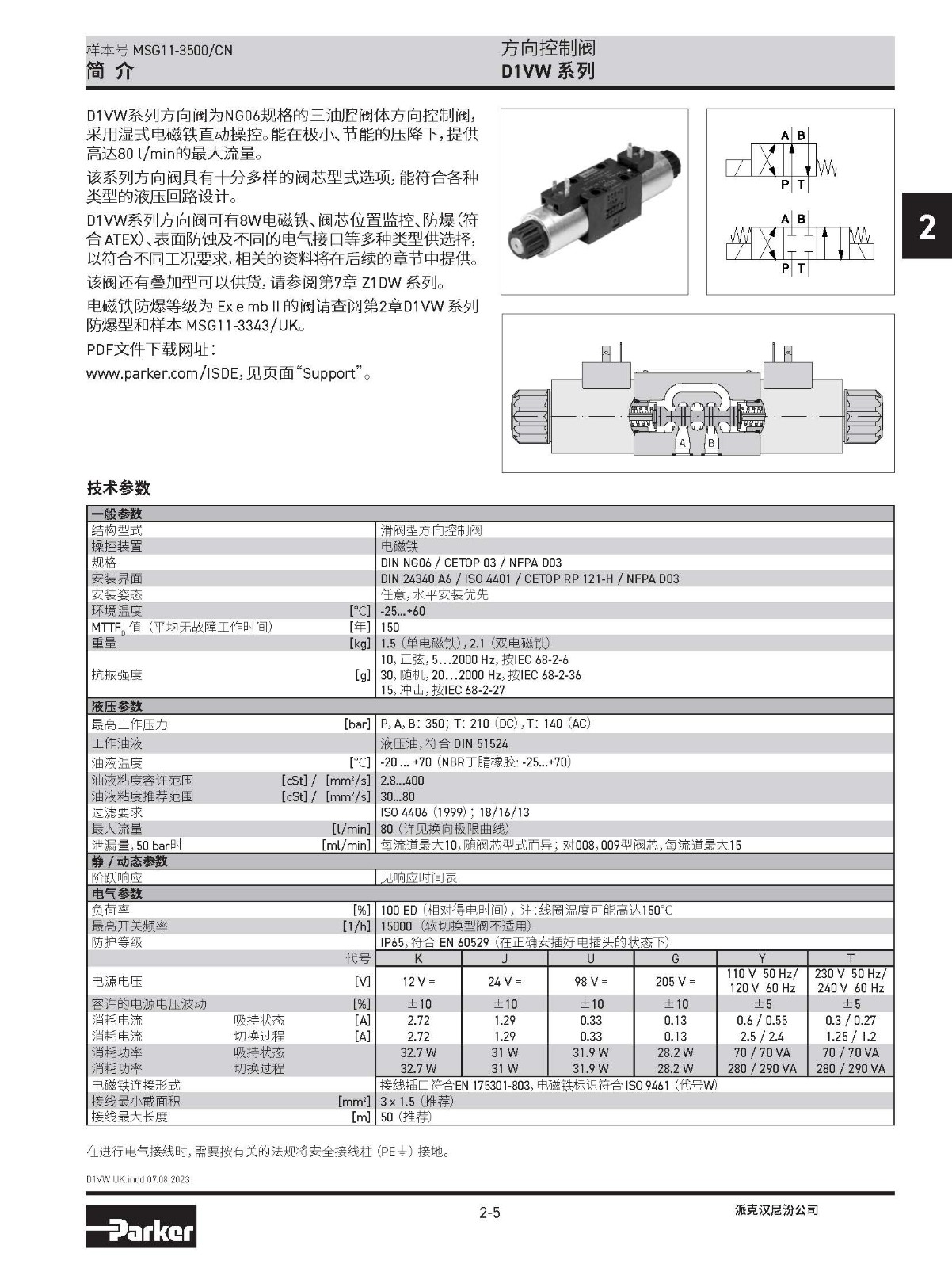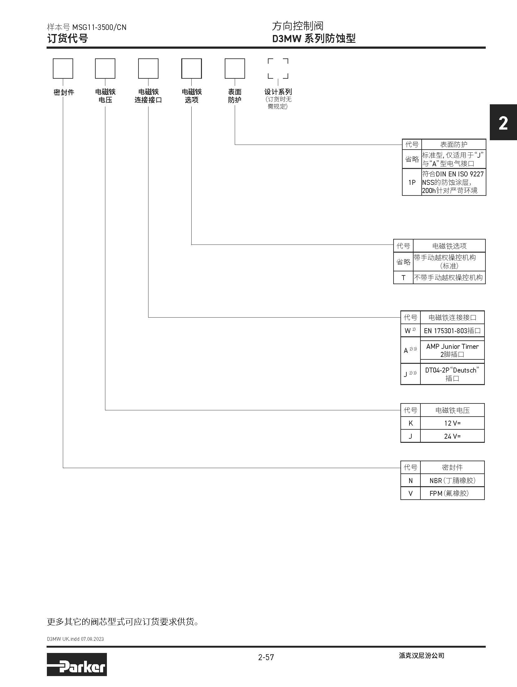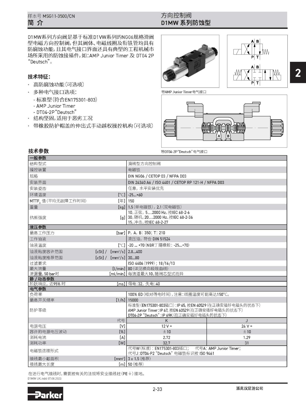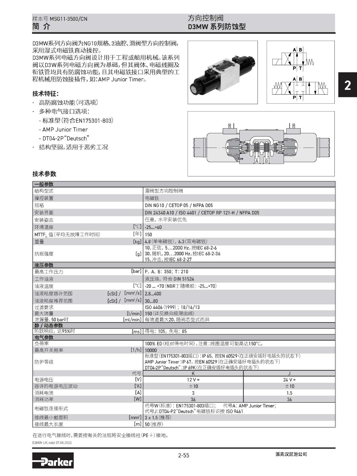 D1MW系列方向閥是基于標(biāo)準(zhǔn)D1VW系列的NG06規(guī)格滑閥 型電磁方向控制閥,但其閥體、電磁線圈及銜鐵管均具有 防腐蝕功能,且其電氣接口界面還具有典型的工程機(jī)械市 場(chǎng)所采用的防蝕接插件,如:AMP Junior Timer 及 DT04 2P “Deutsch”。