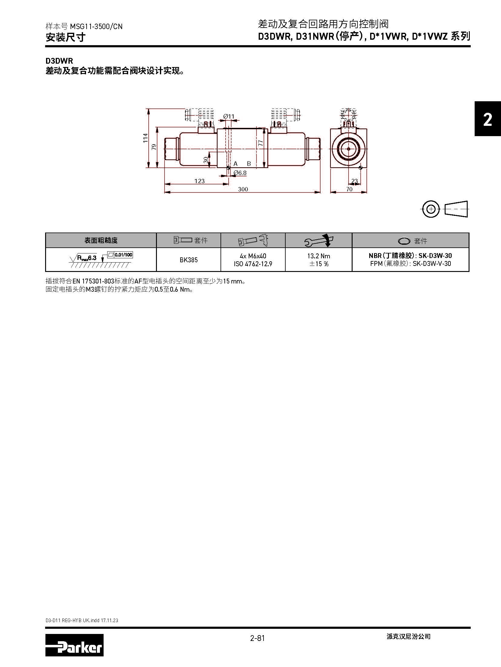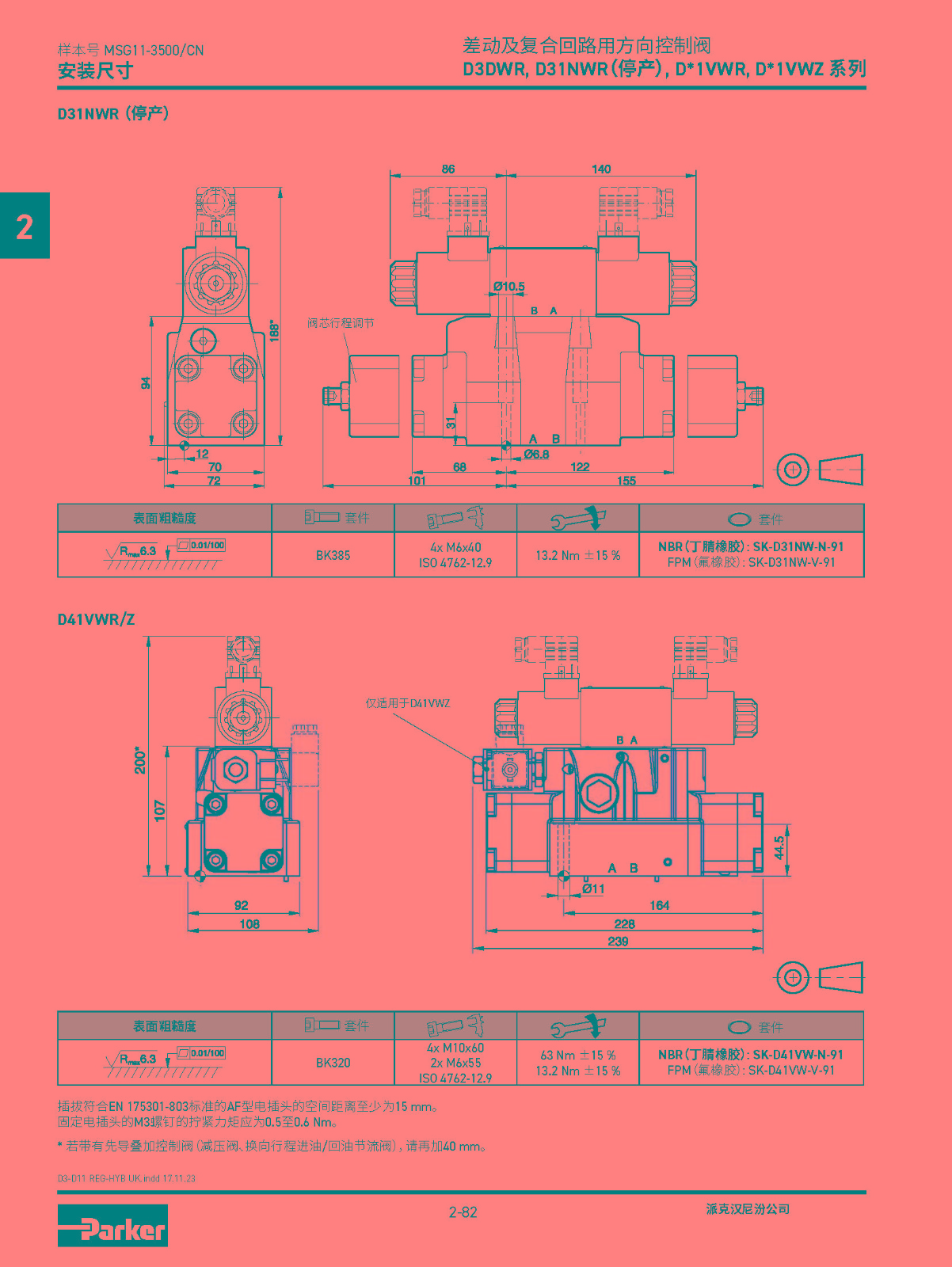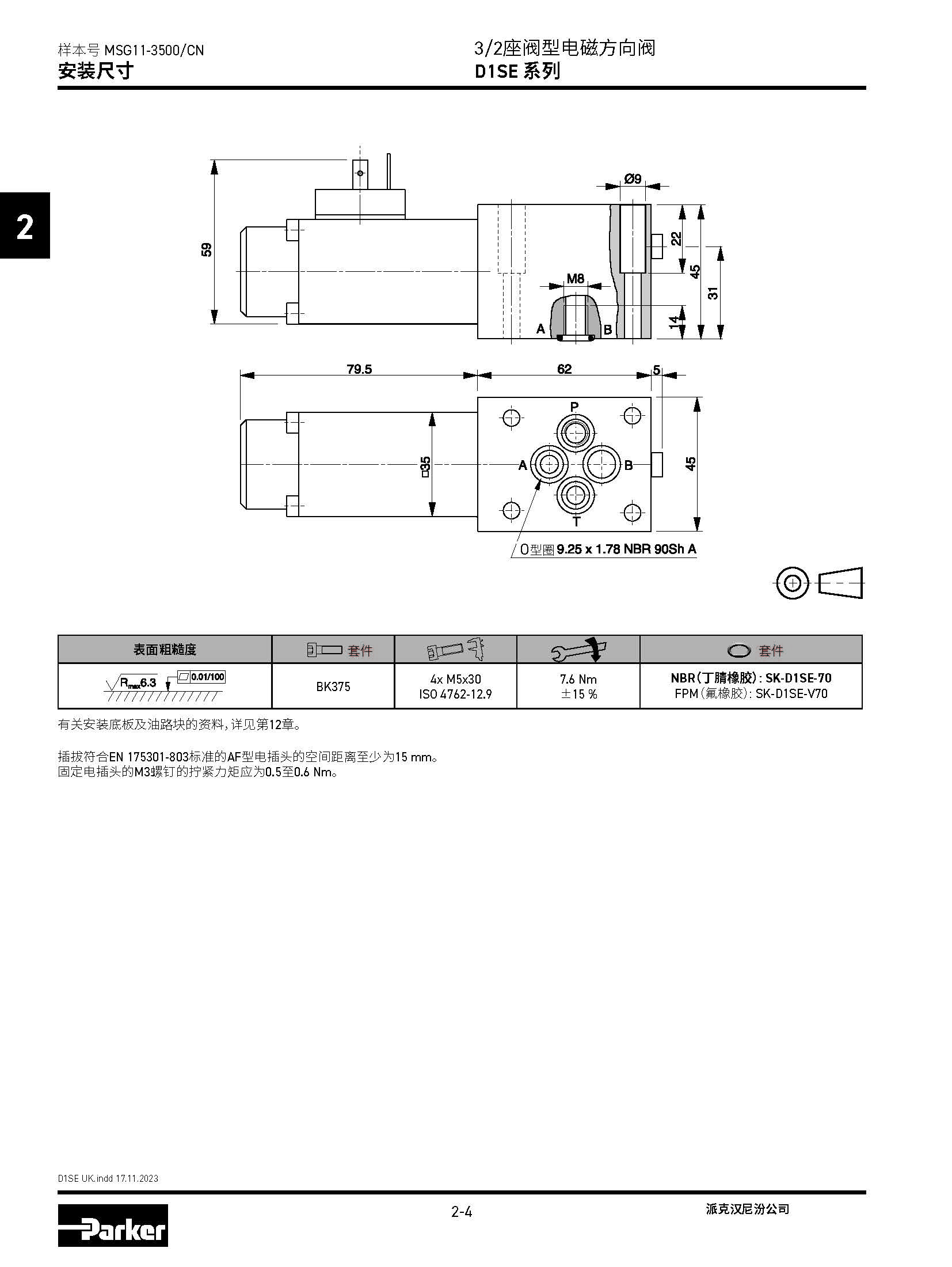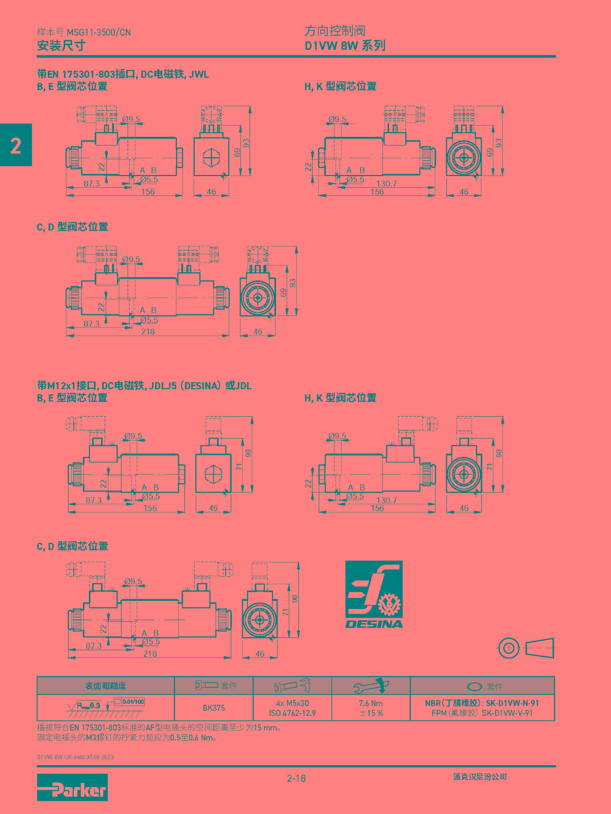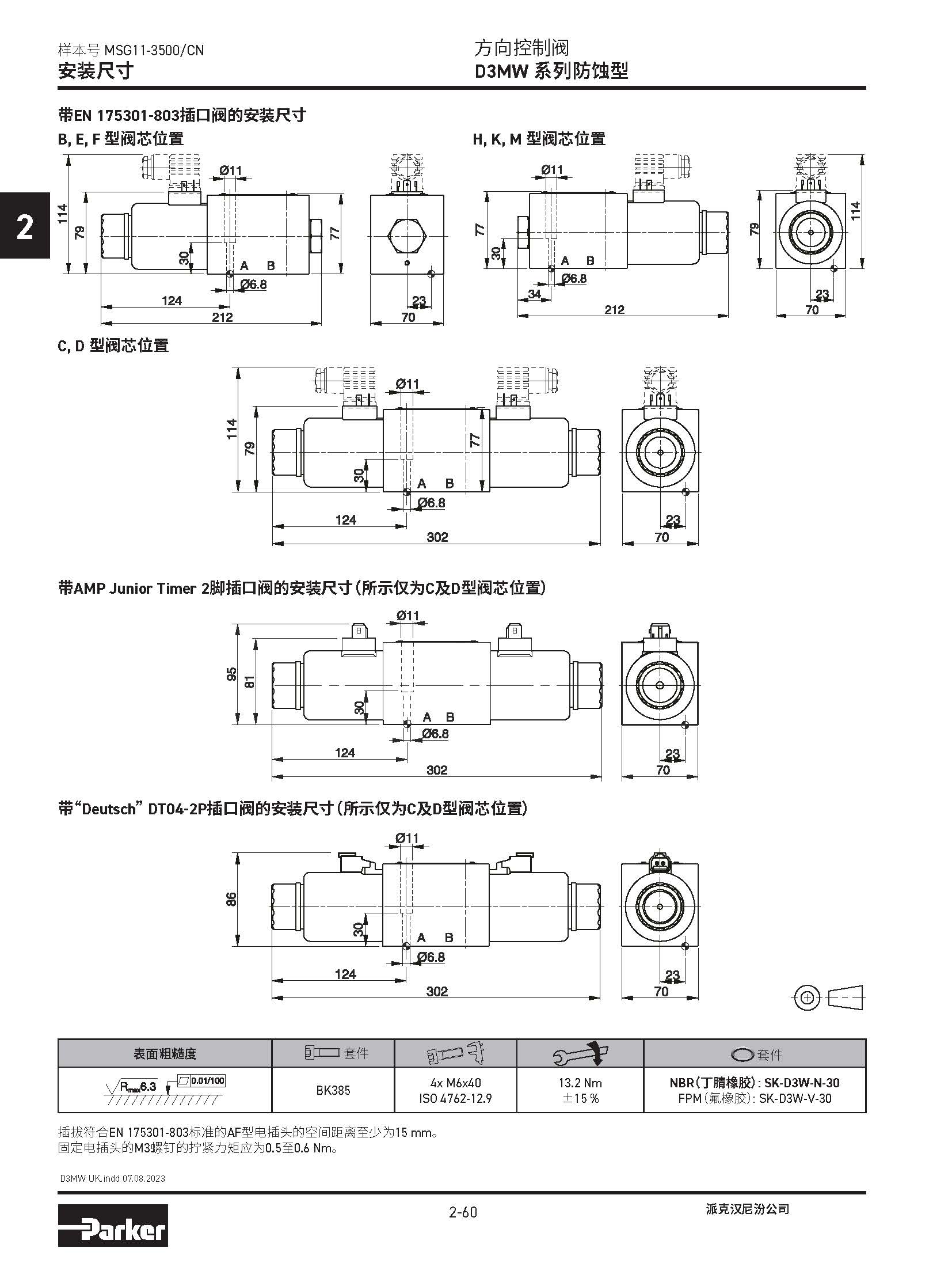 D1MW系列方向閥是基于標(biāo)準(zhǔn)D1VW系列的NG06規(guī)格滑閥 型電磁方向控制閥,但其閥體、電磁線圈及銜鐵管均具有 防腐蝕功能,且其電氣接口界面還具有典型的工程機(jī)械市 場(chǎng)所采用的防蝕接插件,如:AMP Junior Timer 及 DT04 2P “Deutsch”。