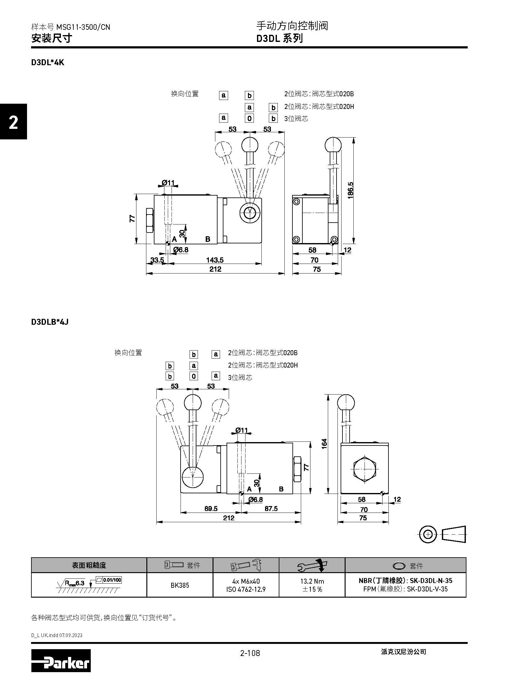 D1VL,D3DL,D4L,D9L系列4/3(三位四通)或4/2(二位四通) 手動(dòng)滑閥式方向控制閥采用與閥芯直接連接的手柄直動(dòng)操 控,其中D1VL系列為3油腔結(jié)構(gòu),而D3DL,D4L及D9L系列則 均為5油腔結(jié)構(gòu)。