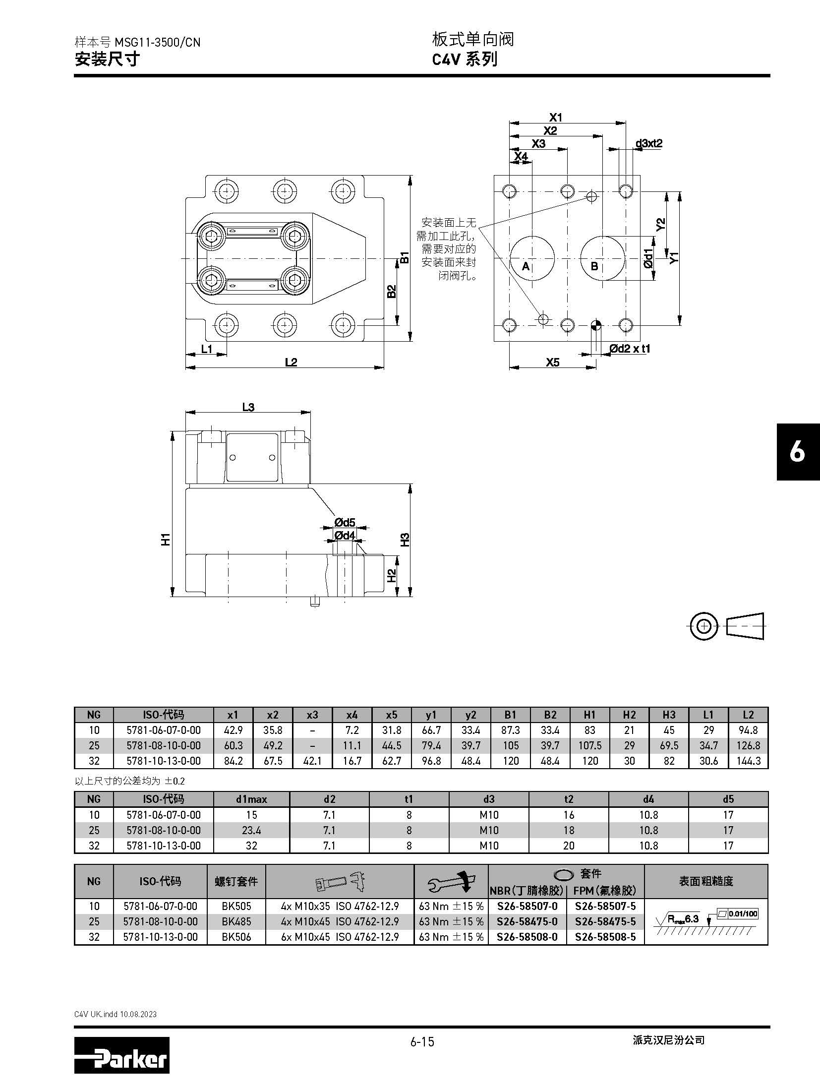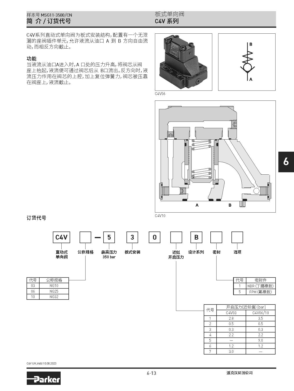 C4V系列直動(dòng)式單向閥為板式安裝結(jié)構(gòu),配置有一個(gè)無泄 漏的座閥插件單元,允許液流從油口 A 到 B 方向自由流 動(dòng),而相反方向截止。