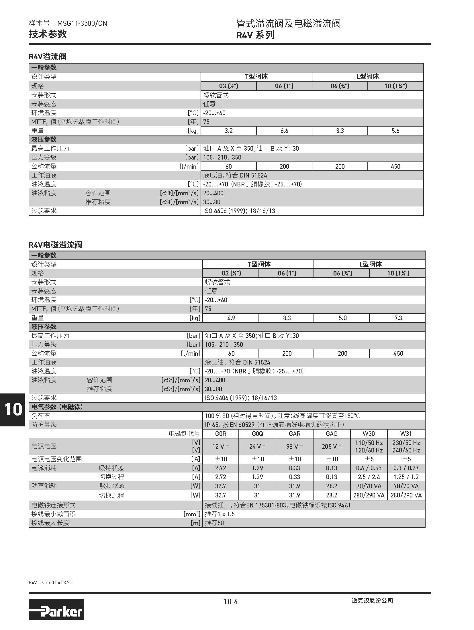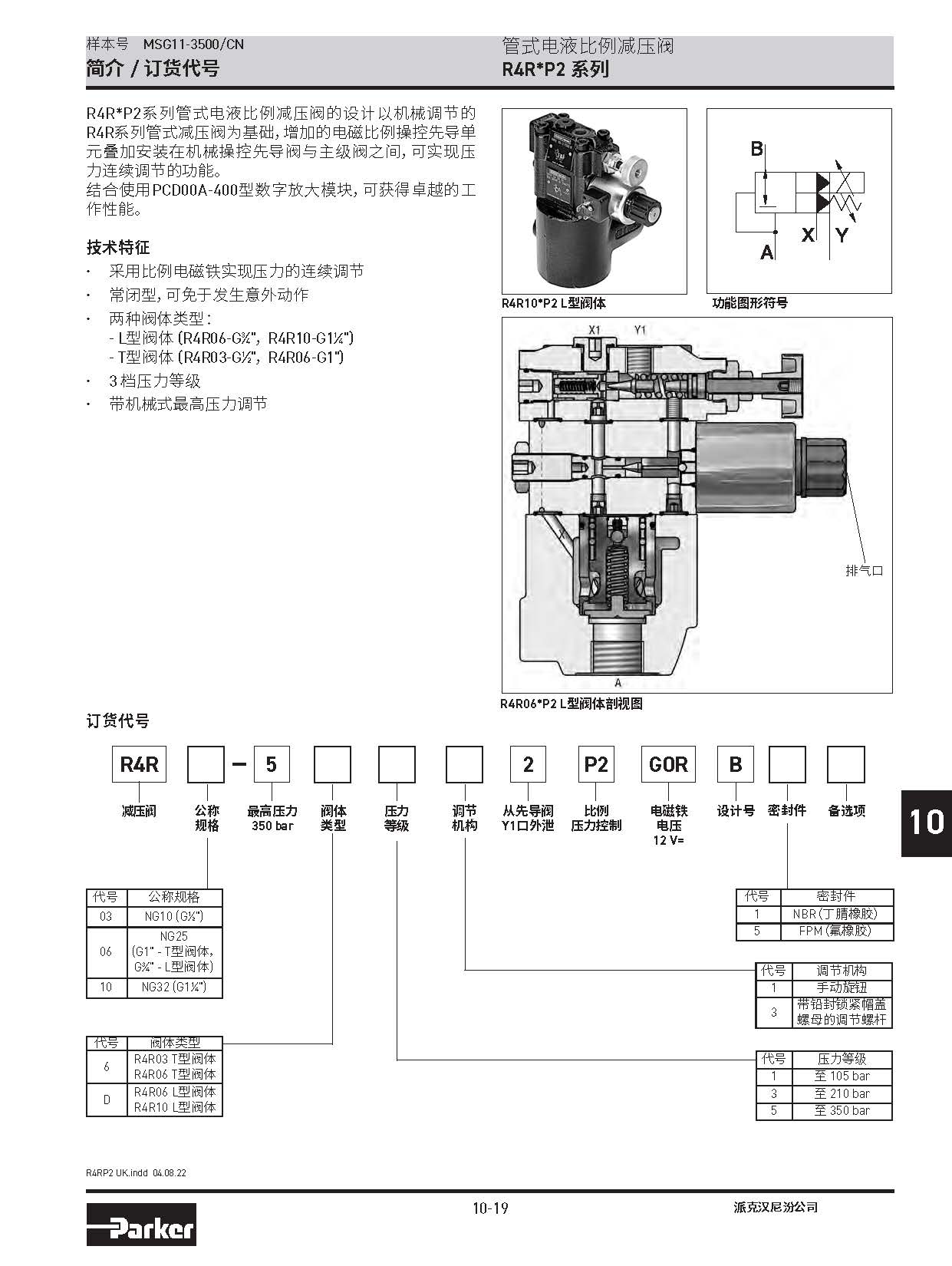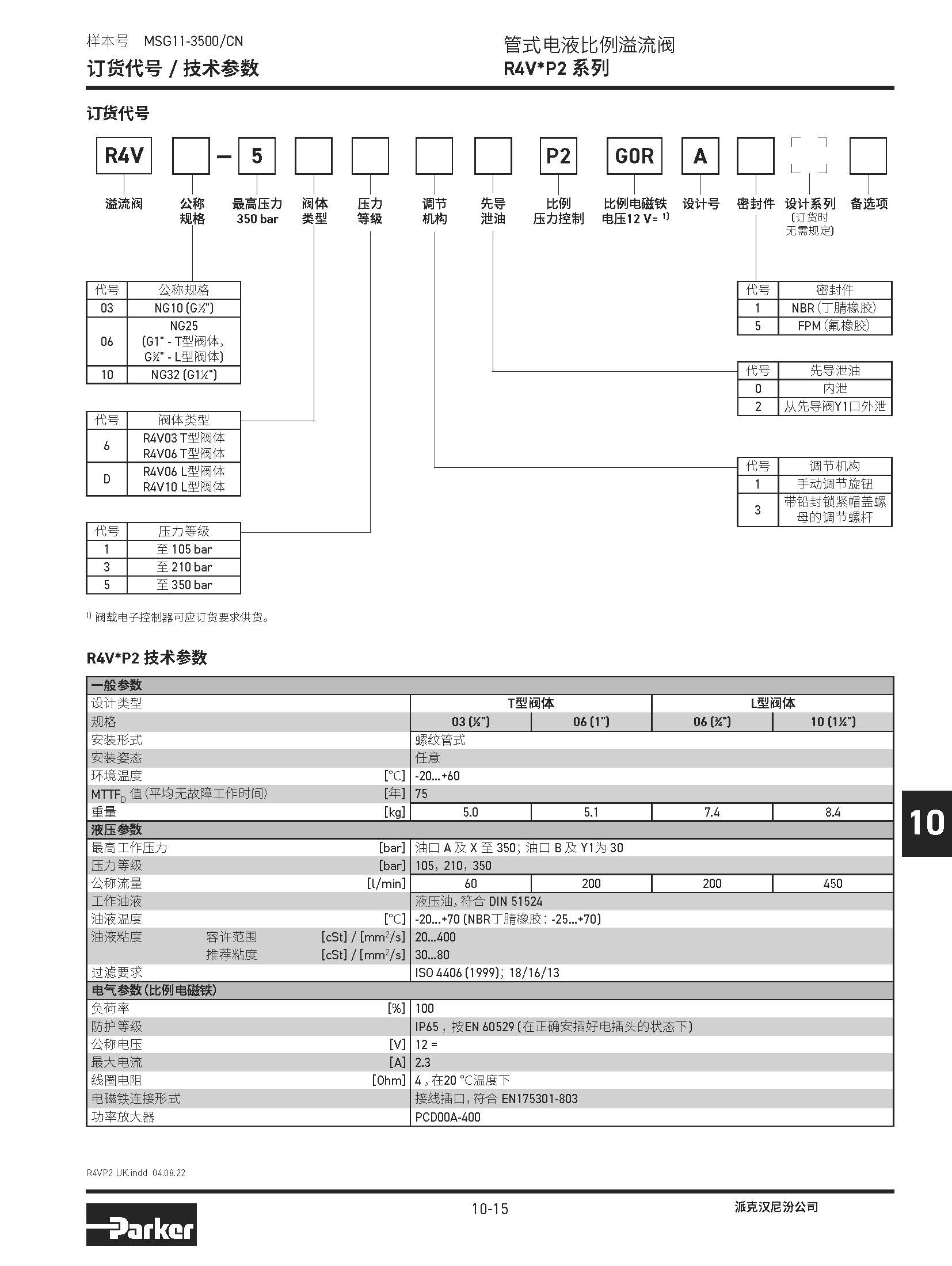 R4V*P2系列管式電液比例溢流閥的設(shè)計(jì)以機(jī)械調(diào)節(jié)的R4V 系列管式溢流閥為基礎(chǔ),增加的電磁比例操控先導(dǎo)單元疊 加安裝在機(jī)械操控先導(dǎo)閥與主級(jí)閥之間,可實(shí)現(xiàn)壓力連續(xù) 調(diào)節(jié)的功能。