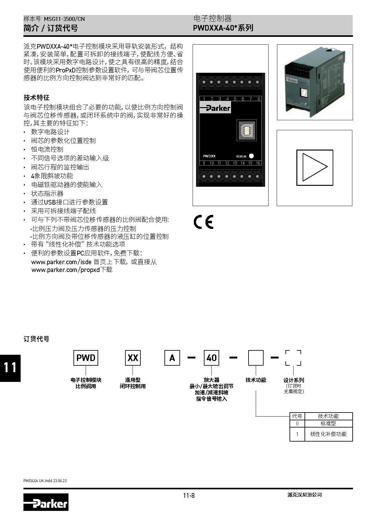 派克PWDXXA-40*電子控制模塊采用導(dǎo)軌安裝形式,結(jié)構(gòu) 緊湊,安裝簡(jiǎn)單,配置可拆卸的接線端子,使配線方便、省 時(shí)。該模塊采用數(shù)字電路設(shè)計(jì),使之具有很高的精度,結(jié)合 使用便利的ProPxD控制參數(shù)設(shè)置軟件,可與帶閥芯位置傳 感器的比例方向控制閥達(dá)到非常好的匹配。