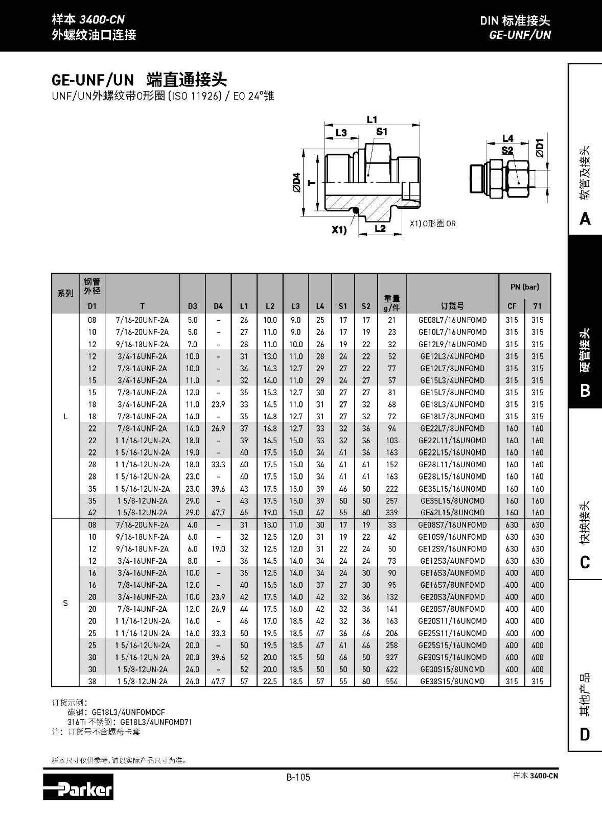 GE-UNF/UN 端直通接頭 UNF/UN外螺紋帶O形圈 (ISO 11926) / EO 24°錐